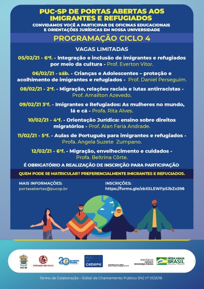 A partir de 5/2, a Coordenadoria de Estudos e Desenvolvimento de Projetos Especiais (CEDEPE) , em parceira com o Escritório Modelo Dom Paulo Evaristo Arns e o Núcleo de Trabalhos Comunitários (NTC), dará início ao Ciclo 4 do projeto “PUC SP de portas abertas aos imigrantes e refugiados”, contrato firmado entre a Fundação São Paulo (Fundasp), e o Ministério da Justiça, que prevê a realização de aulas temáticas para promoção da inclusão social de imigrantes e refugiados na cidade de São Paulo. As aulas serão realizadas pela plataforma Teams e as inscrições devem ser realizadas em: https://forms.gle/xbXSLEWFp5JbZx598.