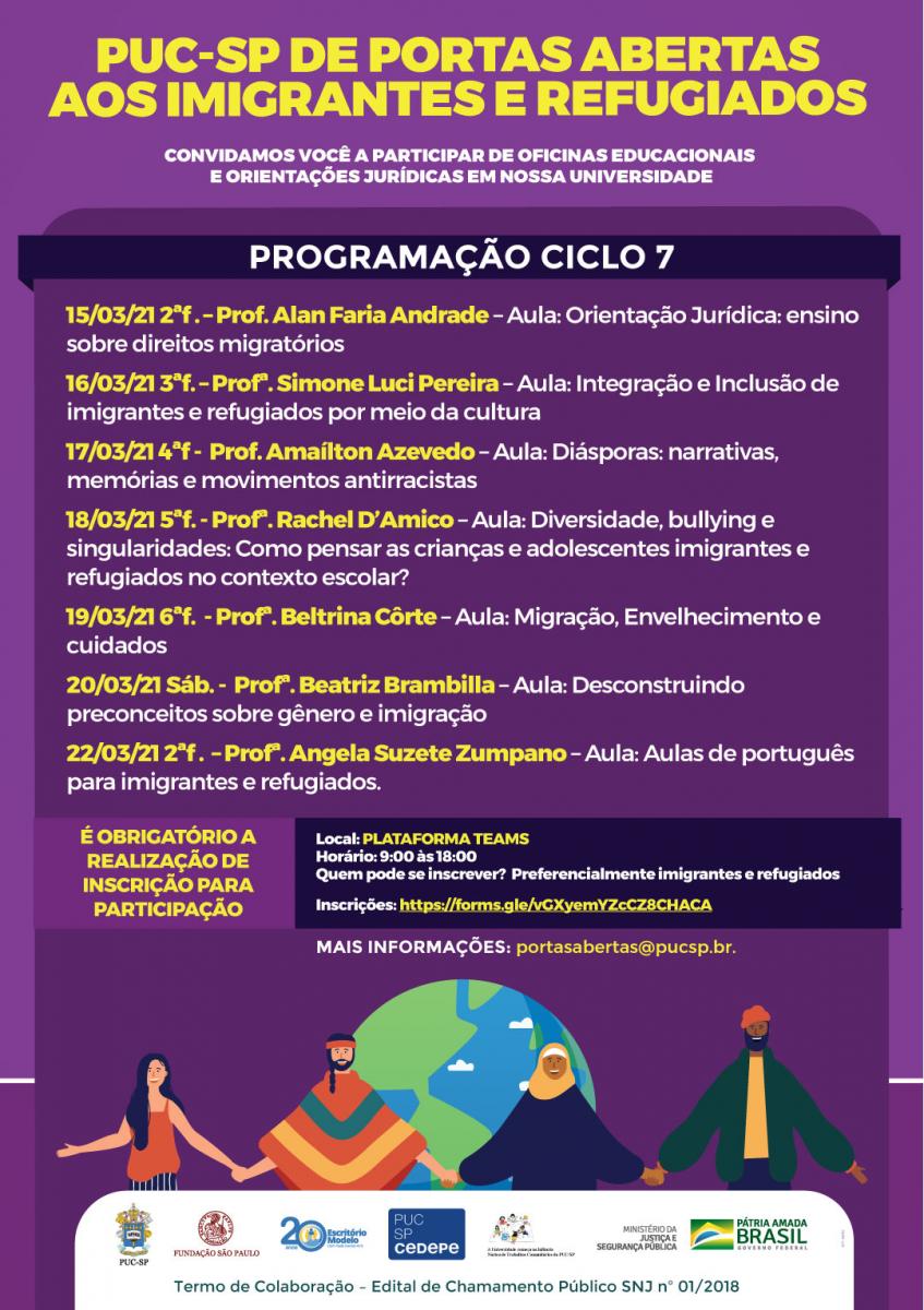“PUC SP de portas abertas aos imigrantes e refugiados” é um projeto que oferece atendimentos e orientação jurídica e também ciclos de formação em sete áreas: 1.Cultura; 2. Idosos; 3. Gênero; 4. Racismo; 5. Crianças e Adolescentes; 6. Língua Portuguesa; 7. Orientação Jurídica.
