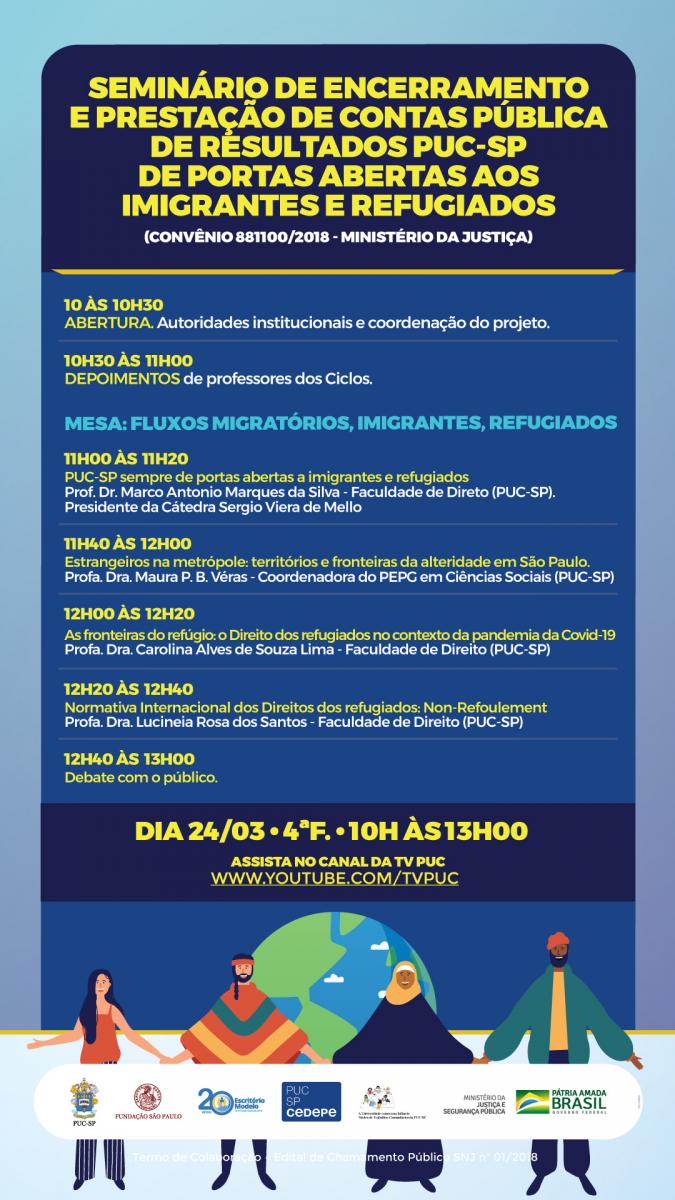 O projeto PUC SP de portas abertas aos imigrantes e refugiados realiza, dia 24/3, às 10h, o ecerramento das atividades e prestação de contas públicas. Acompanhe ao vivo clicando aqui.