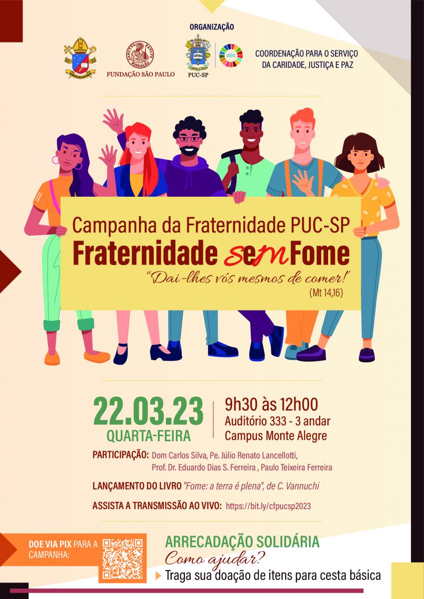 O ministro do Desenvolvimento Agrário, Paulo Teixeira, o coordenador da Pastoral do Povo de Rua de São Paulo, pe. Julio Lancellotti, e o prof. Eduardo Ferreira (Fac. de Direito) participam, dia 22/3, no campus Monte Alegre, de evento sobre a Campanha da Fraternidade da CNBB, que em 2023 leva o tema Fome no Brasil. Clique aqui para saber como colaborar com doações.