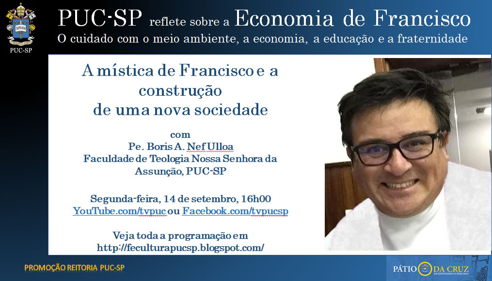 Tem início, no dia 14/9, o evento PUC-SP reflete sobre a Economia de Francisco: o cuidado com o meio ambiente, a economia, a educação e a fraternidade. Promovido pela Reitoria e pelo Núcleo Fé e Cultura, o evento oferece uma série de encontros até o mês de novembro. Clique aqui para ver a programação completa.