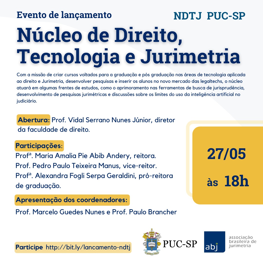 No dia 27/5, às 18h, será realizado o lançamento online do Núcleo de Direito, Tecnologia e Jurimetria da PUC-SP. Com a missão de criar cursos variados para a graduação e a pós-graduação nas áreas de tecnologia aplicada ao Direito e Jurimetria, desenvolver pesquisas e inserir os alunos no novo mercado das legaltechs, o núcleo atuará em algumas frentes de estudos, como o aprimoramento nas ferramentas de busca de jurisprudência, desenvolvimento de pesquisas jurimétricas e discussões sobre os limites do uso da inteligência artificial no judiciário.