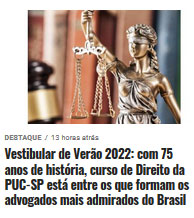 O portal especializado em notícias sobre acesso ao eninso superior publicou a reportagem Vestibular de Verão 2022: com 75 anos de história, curso de Direito da PUC-SP está entre os que formam os advogados mais admirados do Brasil.