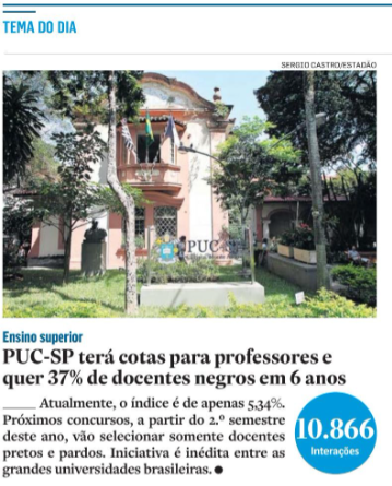 PUC-SP na Mídia: repercussão da política de cotas para docentes negros foi "Tema do Dia" no Estadão