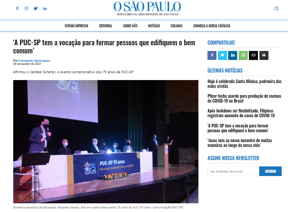 O jornal O São Paulo, da Arquidiocese de São Paulo, destacou a sessão solene no Tuca, no dia 24/8, e a missa celebrativa dos 75 anos da PUC-SP, realizada no último dia 20/8, na capela do campus Monte Alegre.