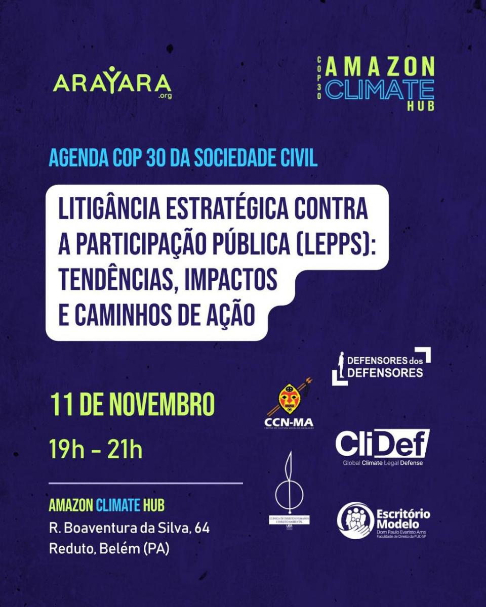 A atividade integra a Agenda COP 30 da Sociedade Civil e é organizada por entidades que atuam na defesa de direitos humanos e ambientais, entre elas o Escritório Modelo Dom Paulo Evaristo Arns, da Faculdade de Direito da PUC-SP, o Global Climate Legal Defense (CliDef) e a Arayara.org.