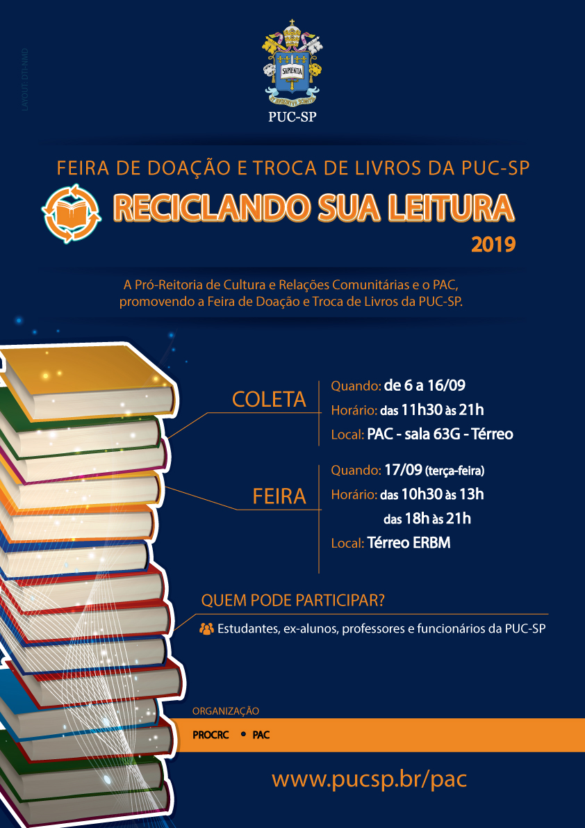Estudantes, professores, funcionários e ex-alunos da PUC-SP podem participar de Feira de Doação e Troca de Livros “Reciclando sua Leitura”, edição de 2019. Até 16/9, estão sendo coletados livro, no Setor de Atendimento Comunitário (PAC), no campus Monte Alegre (sala 63G, térreo, prédio Novo).