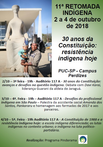 Até 4/10, segue a 11ª Retomada Indígena, com o tema 30 anos da Constituição – resistência indígena hoje. As atividades são realizadas no campus Monte Alegre, sempre às 19h, na sala 117-A (1º andar, prédio novo). Clique aqui e saiba mais.