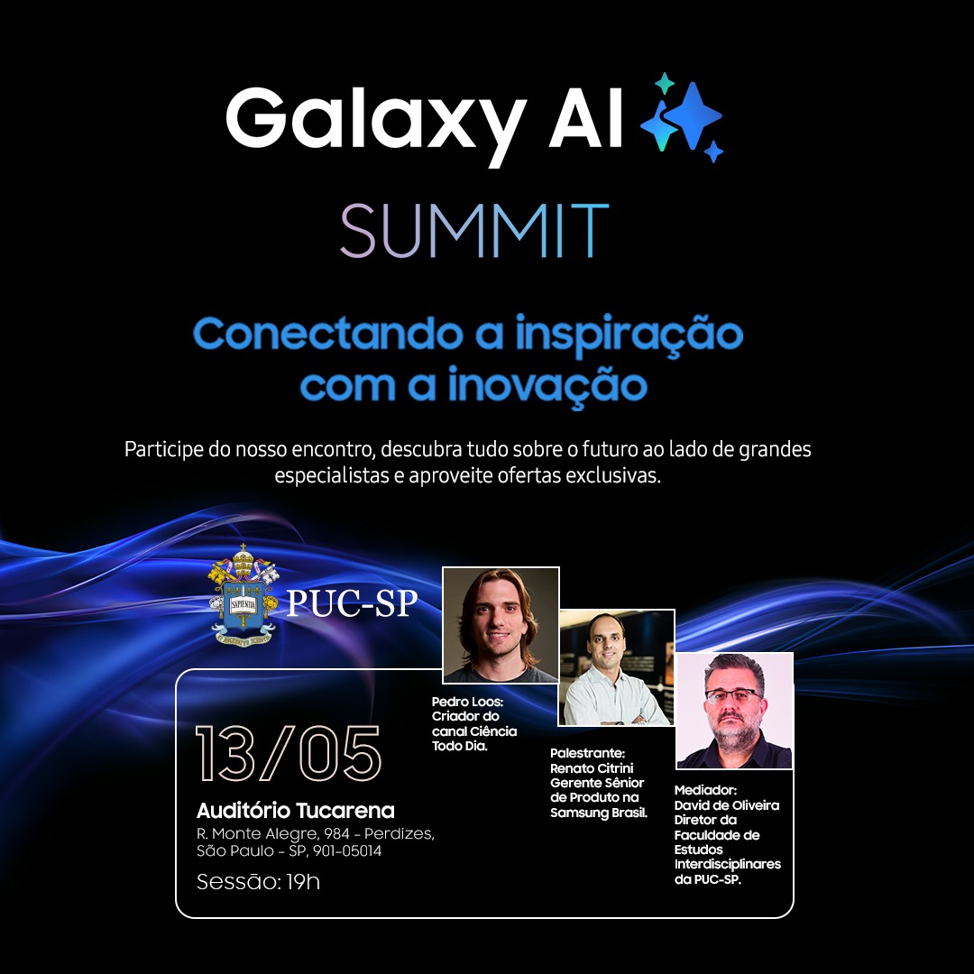 Nos próximos dias 13 e 14/5, acontece na PUC-SP o encontro Galaxy IA Summit: conectando a inspiração com a inovação. Participam Pedro Loos, criador do canal Ciência Todo Dia, e Renato Citrini, gerente Sênior de Produto na Samsung Brasil.