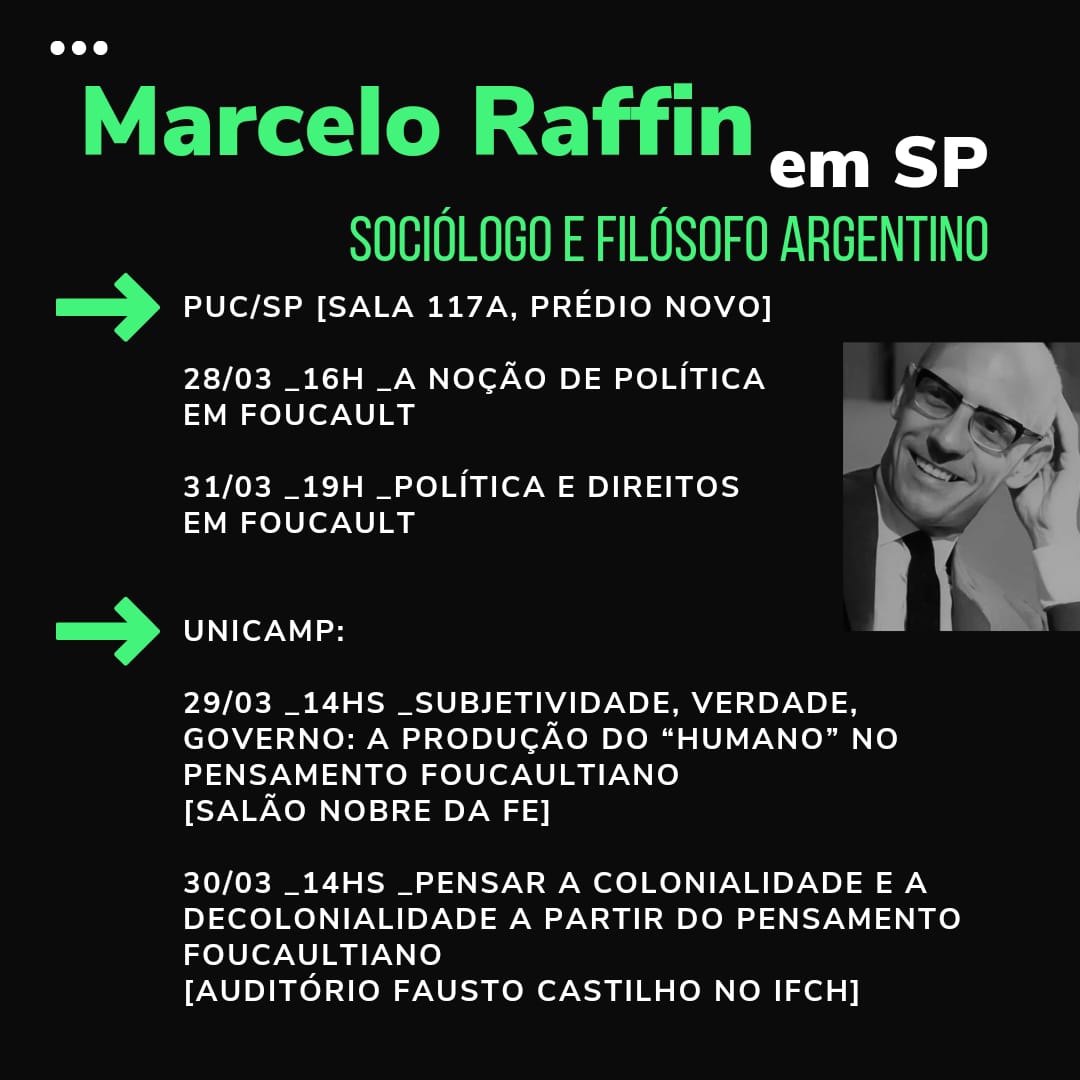 De 28 a 31/3, o prof. Marcelo Raffin (Universidade de Buenos Aires, Argentina) participa de ciclo de conferências na PUC-SP e na Unicamp.
