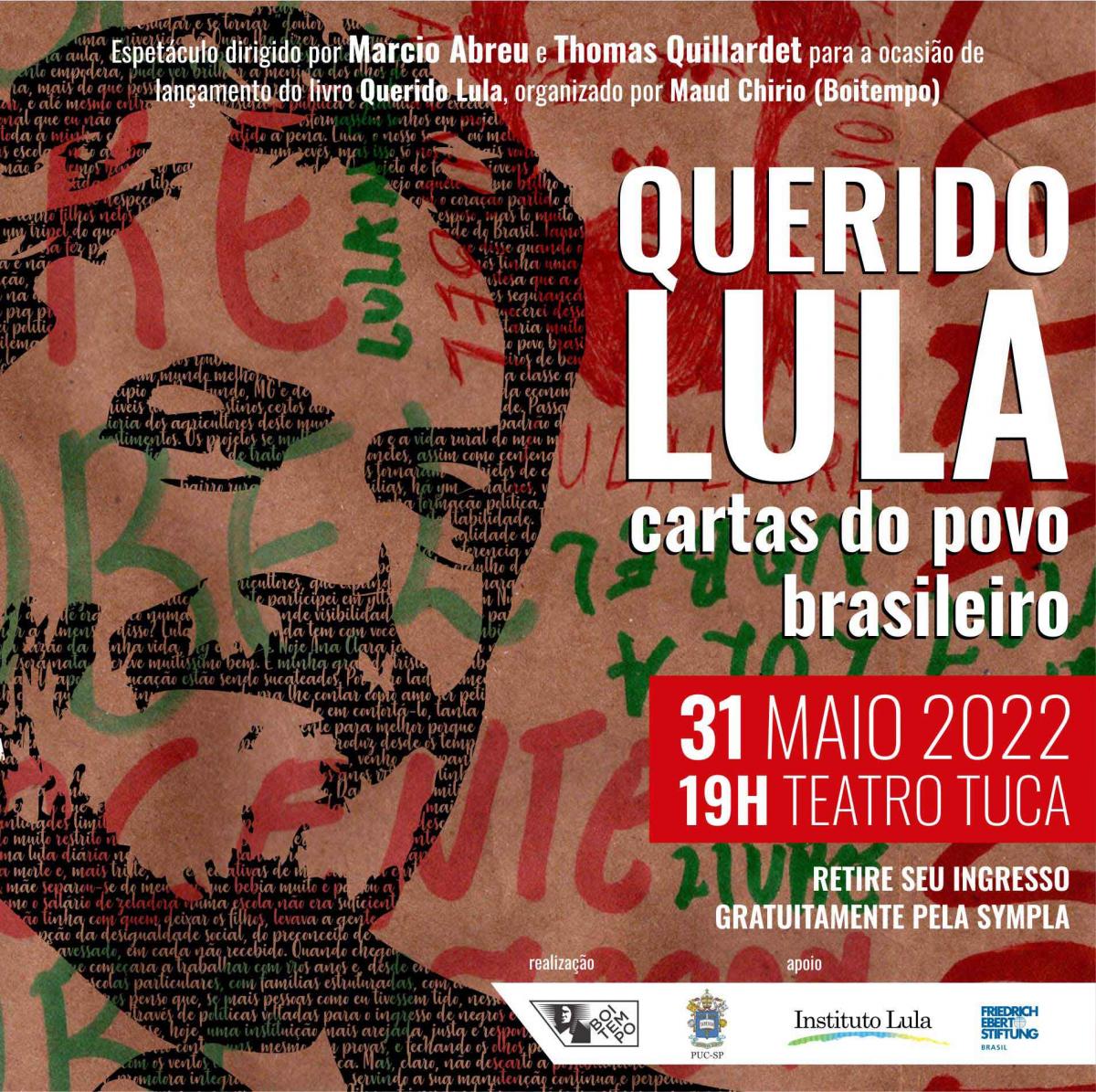 A TV PUC fará a transmissão ao vivo, dia 31/5, no Tuca, a partir das 19h, do evento Querido Lula. Diversos artistas participam da apresentação da obra, em forma de lançamento-espetáculo. Está prevista a presença do ex-presidente na atividade da Boitempo. Querido Lula: cartas a um presidente na prisão reúne 46 textos, de um total de 25 mil enviados a ele durante o cárcere ilegal em Curitiba.