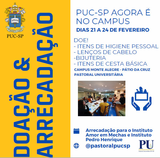 O reencontro presencial nos campi também será um momento de praticar a solidariedade. De 21 a 24/2, a Pastoral Universitária promove campanha de arrecadação de itens de higiene pessoal e de cesta básica, lenços de cabelo e bijuterias.