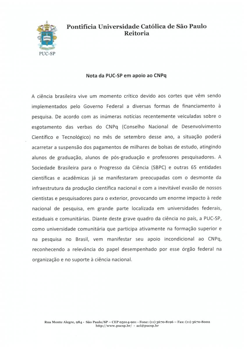 A Reitoria da PUC-SP divulgou em 22/08 uma nota de apoio ao CNPq. Clique aqui e leia a nota divulgada na íntegra.