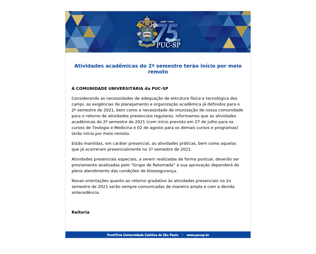 A reitoria divulgou nota informando que o retorno das atividades acadêmicas do 2º semestre de 2021 (com início previsto em 27/7 para os cursos de Teologia e Medicina e 02/08 para os demais cursos e programas) terá início por meio remoto. Serão mantidas, em caráter presencial, as atividades práticas, bem como aquelas que já ocorreram presencialmente no 1º semestre de 2021.