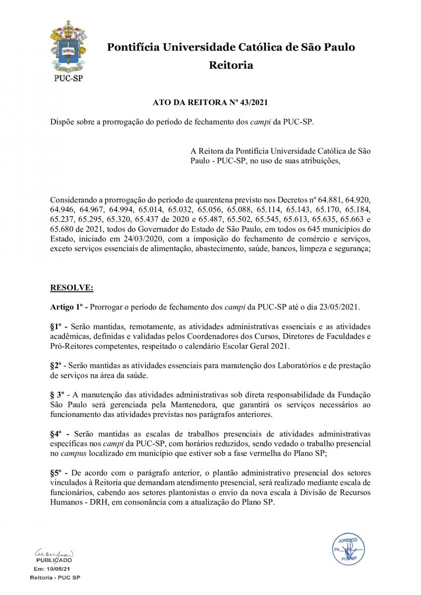 A PUC-SP mantém a suspensão das atividades presenciais até 23/05/2021, em atendimento à definição das autoridades do estado e da cidade de São Paulo que prorroga a quarentena até a referida data.
