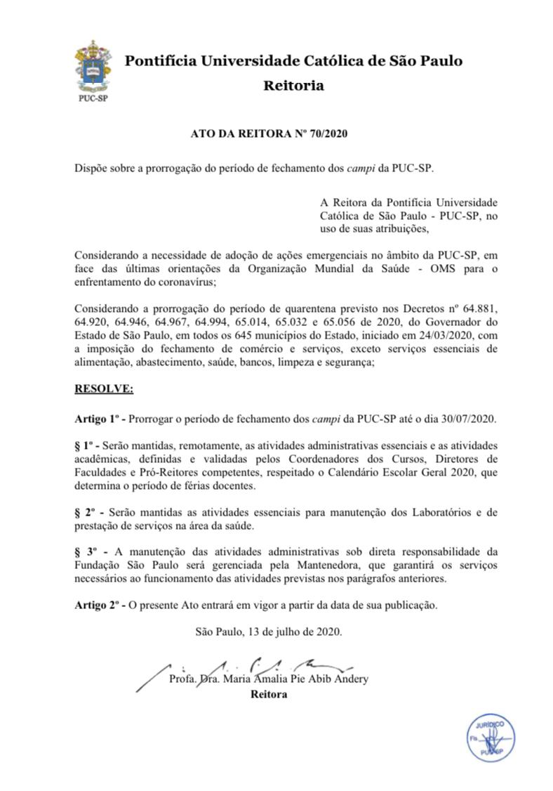 A PUC-SP estenderá a suspensão das atividades presenciais até 30/07/2020, em atendimento à definição das autoridades do estado e da cidade de São Paulo que estende a quarentena até a referida data.