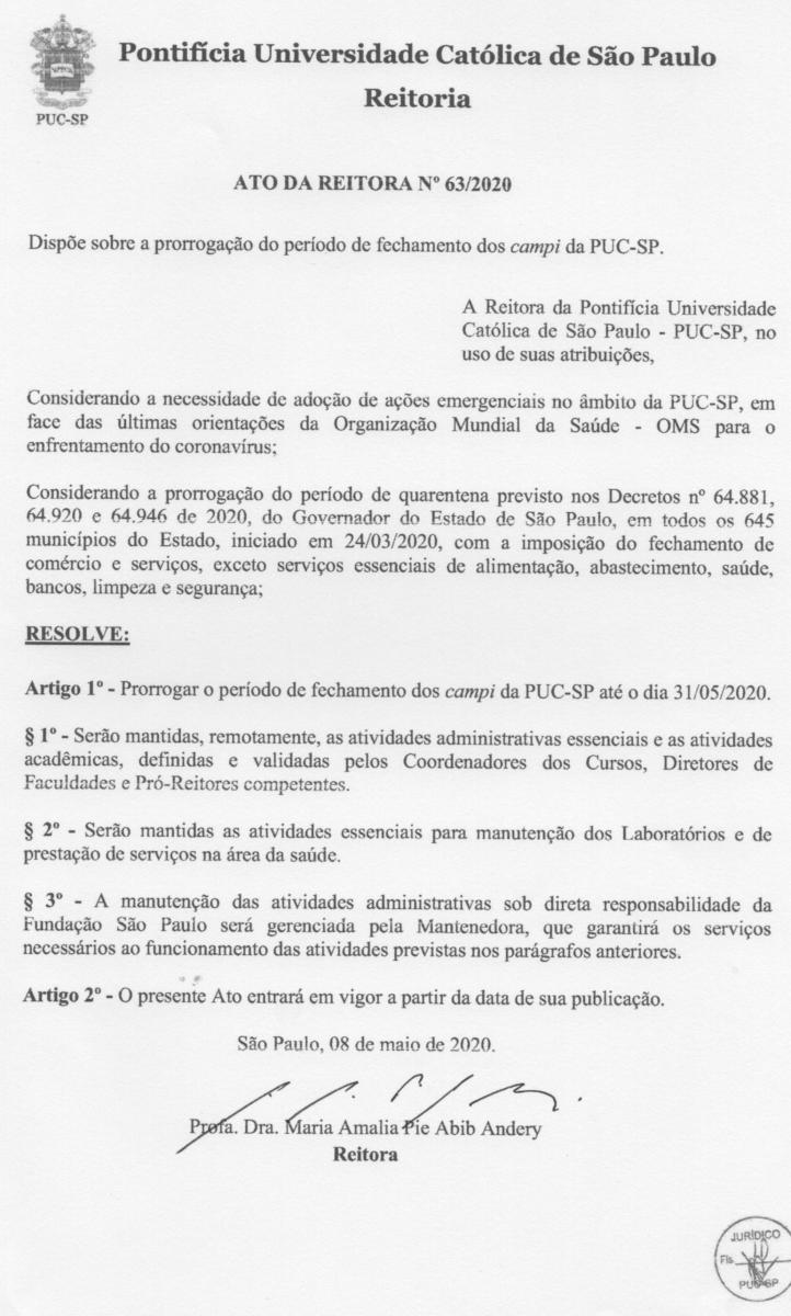 A PUC-SP prorrogará a suspensão das atividades presenciais até 31/05/2020, em atendimento à determinação do governo e das autoridades sanitárias do estado de São Paulo, que decidiram pela manutenção das medidas de afastamento social na tarde desta sexta-feira (08/05).