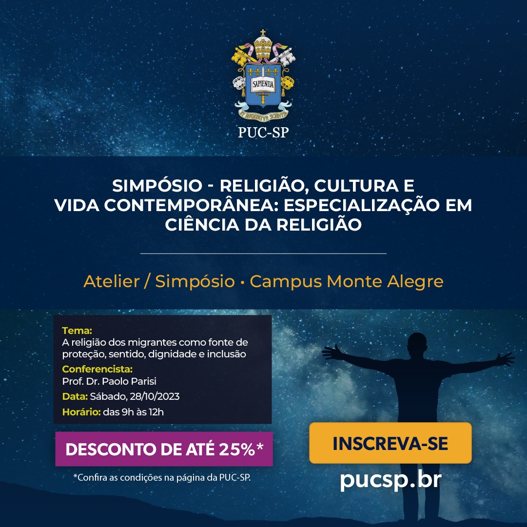 No dia 28/10, das 9 às 12h, o curso Religião, Cultura e Vida Contemporânea: Especialização em Ciência da Religião realiza o Simpósio: A religião dos migrantes como fonte de proteção, sentido, dignidade e inclusão.