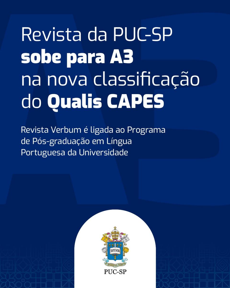 A Revista Verbum – Cadernos de Pós-Graduação em Língua Portuguesa, vinculada à Pontifícia Universidade Católica de São Paulo (PUC-SP), avançou de B2 para A3 na nova avaliação do Qualis CAPES, referente ao quadriênio 2021–2024. A atualização do sistema, divulgada recentemente pela Coordenação de Aperfeiçoamento de Pessoal de Nível Superior (CAPES), reconhece a qualidade editorial e científica do periódico.