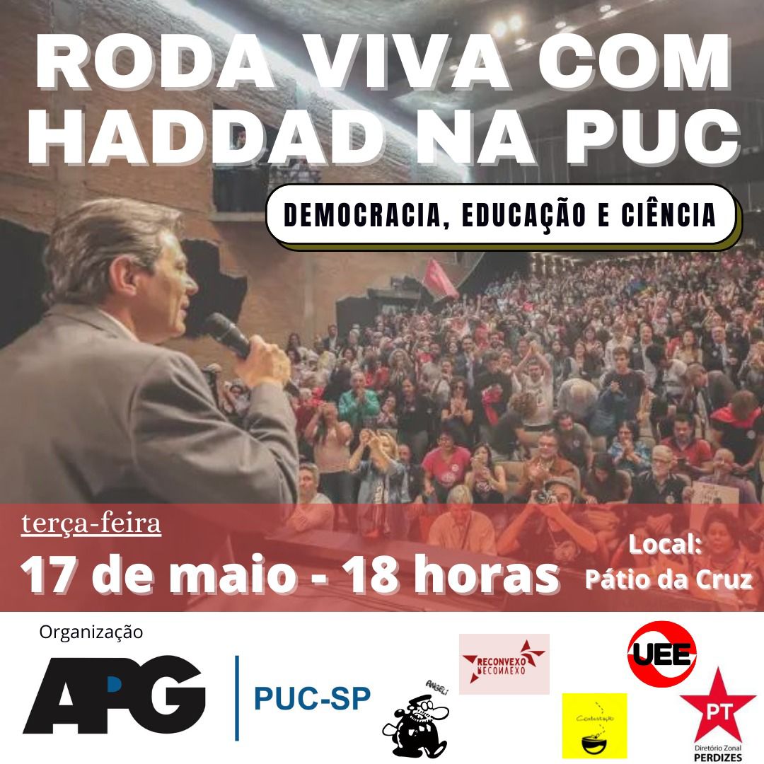 As entidades representativas dos discentes da PUC São Paulo, a Associação de Pós-Graduandos (APG PUC/SP), o Centro Acadêmico Benevides Paixão (Jornalismo), o Coletivo Contestação, o Coletivo Reconvexo, e também a União Estadual dos Estudantes (UEE) e o DZ PT Perdizes convidam para o evento Roda Viva com Haddad na PUC, que será realizada dia 17/5, às 18h, na Quadra, no campus Monte Alegre).
