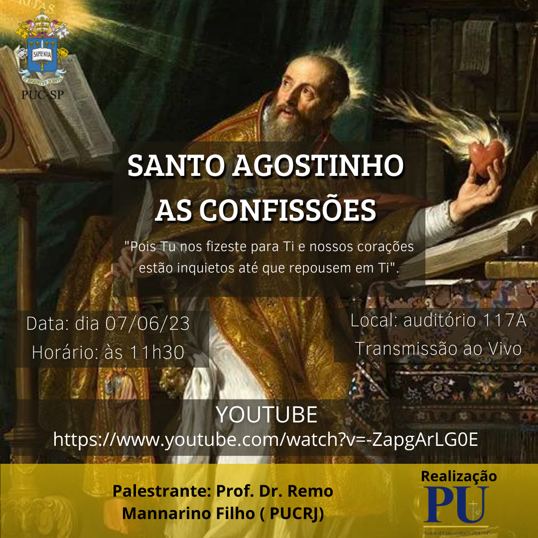 A Pastoral Universitária realiza, dia 7/6, às 11h30, a palestra Santo Agostinho – as confissões, no campus Monte Alegre e transimssão ao vivo.
