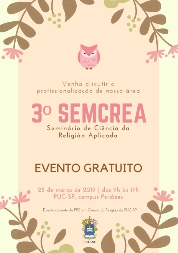 Está aberto, até 31/12, o período para submissão de trabalhos para o 3º Seminário de Ciência da Religião Aplicada (Semcrea), que se realizará no campus Monte Alegre, em 25 de março de 2019.