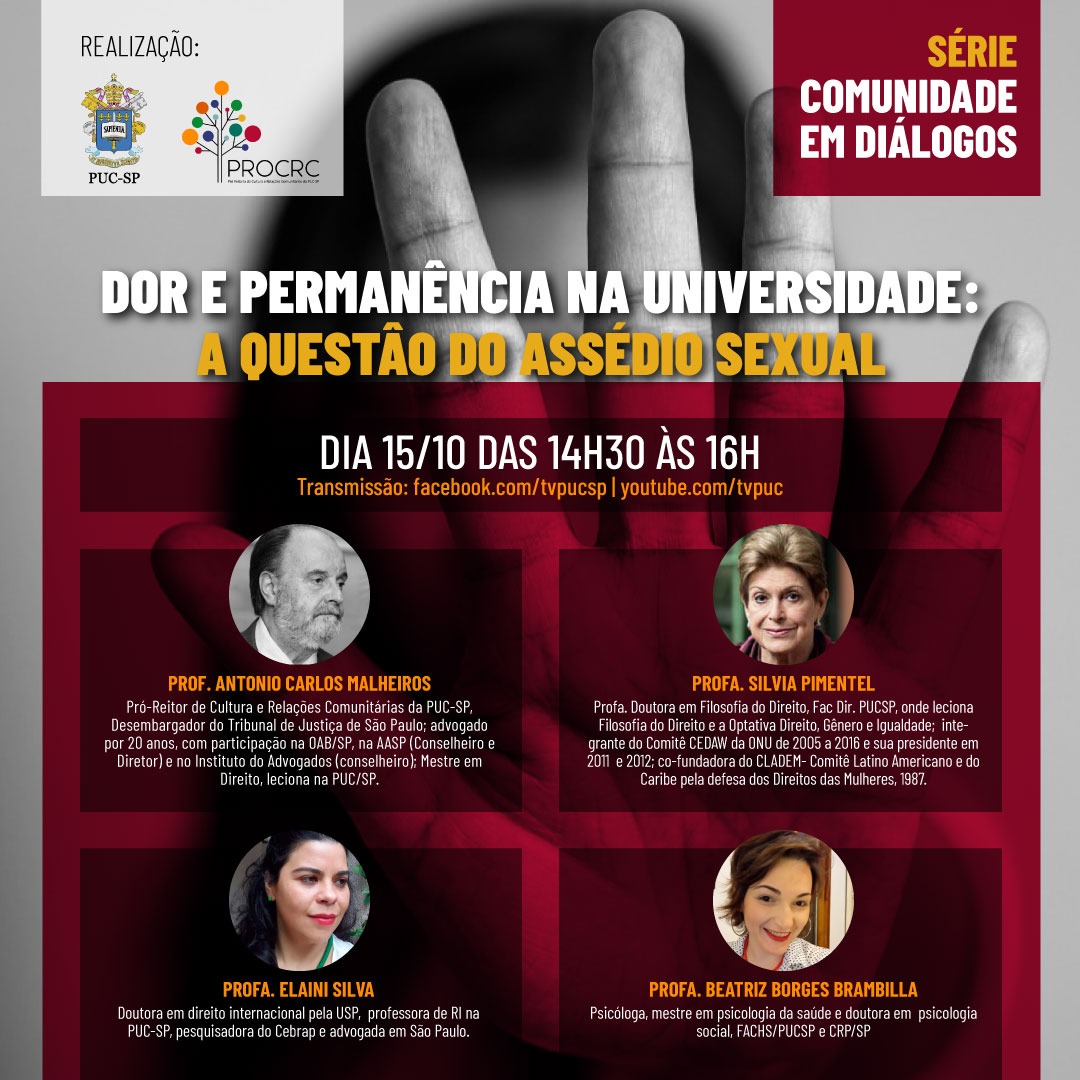 A série Comunidade em diálogos realiza, dia 15/10, das 14h30 às 16h, o debate Dor e permanência na universidade: a questão do assédio sexual.