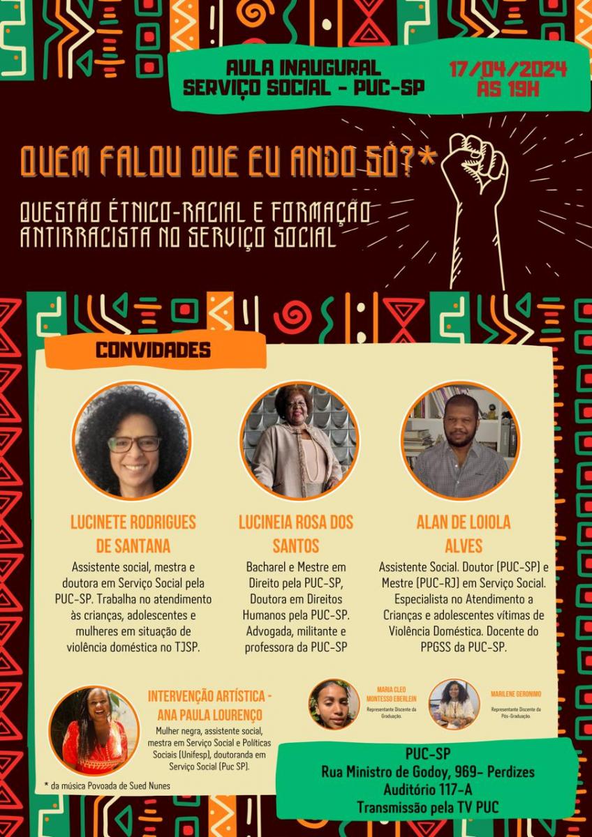 No dia 17/4, às 19h, acontece a aula inaugural do curso de Serviço Social, com o tema "Quem Falou que Eu Ando Só? - Questão étnico-racial e formação antirracista no serviço social".