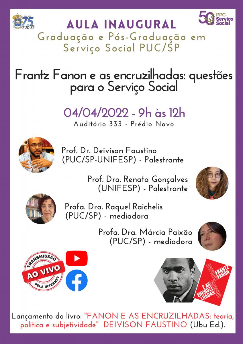Dia 4/4, das 9 às 12h, a área de Serviço Social realiza a aula inaugural integrada de graduação e pós-graduação, com o tema Frantz Fanon e as encruzilhadas: questões para o Serviço Social.