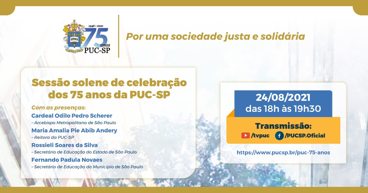 O cardeal Odilo Pedro Scherer e a reitora Maria Amalia Andery participam da sessão solene de abertura das comemorações de aniversário dos 75 anos da PUC-SP. Clique aqui para acessar o link da transmissão.