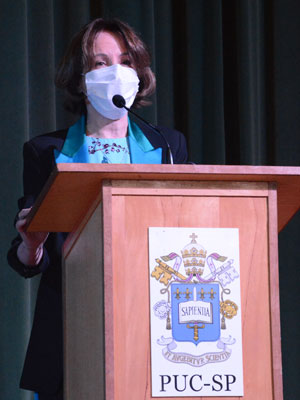 Em seguida, a profa. Maria Amalia fez um resgate da história das instituições de ensino superior no Brasil, desde que se criou a primeira delas, em 1920, a Universidade Nacional. “Inicialmente proibida de constituir universidades no Brasil (na contramão da história das universidades no mundo), a Igreja Católica (que esteve presente na educação superior com escolas isoladas de maneira importante desde os séculos XVII e XIX) finalmente obteve, em 1945, autorização para criar sua primeira universidade, a Universidade Católica do Rio de Janeiro. Já no ano seguinte, em 22 agosto de 1946, cria a Universidade Católica (do Estado) de São Paulo, mantida pela Fundação São Paulo desde outubro de 1946, e logo depois (1947) transformada em Pontifícia Universidade Católica de São Paulo. Somos uma das 10 primeiras universidades brasileiras”, afirmou a reitora.