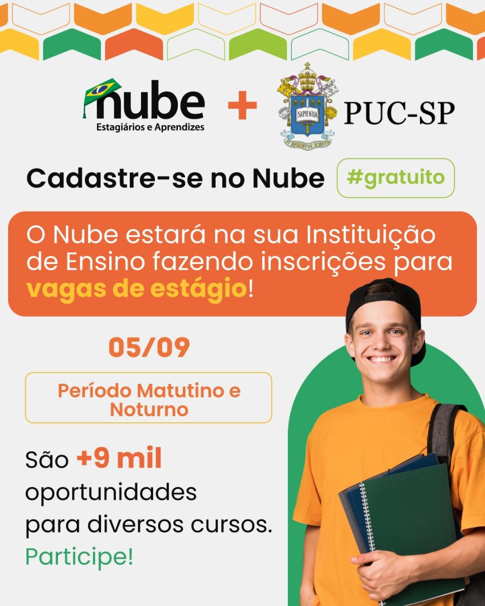 O Setor de Estágios da PUC-SP promove uma ação em parceria com a NUBE no campus Consolação. Na atividade, os interessados poderão cadastrar seus currículos em vagas de estágio. São mais de 9 mil vagas disponíveis para os alunos do período matutino e noturno.