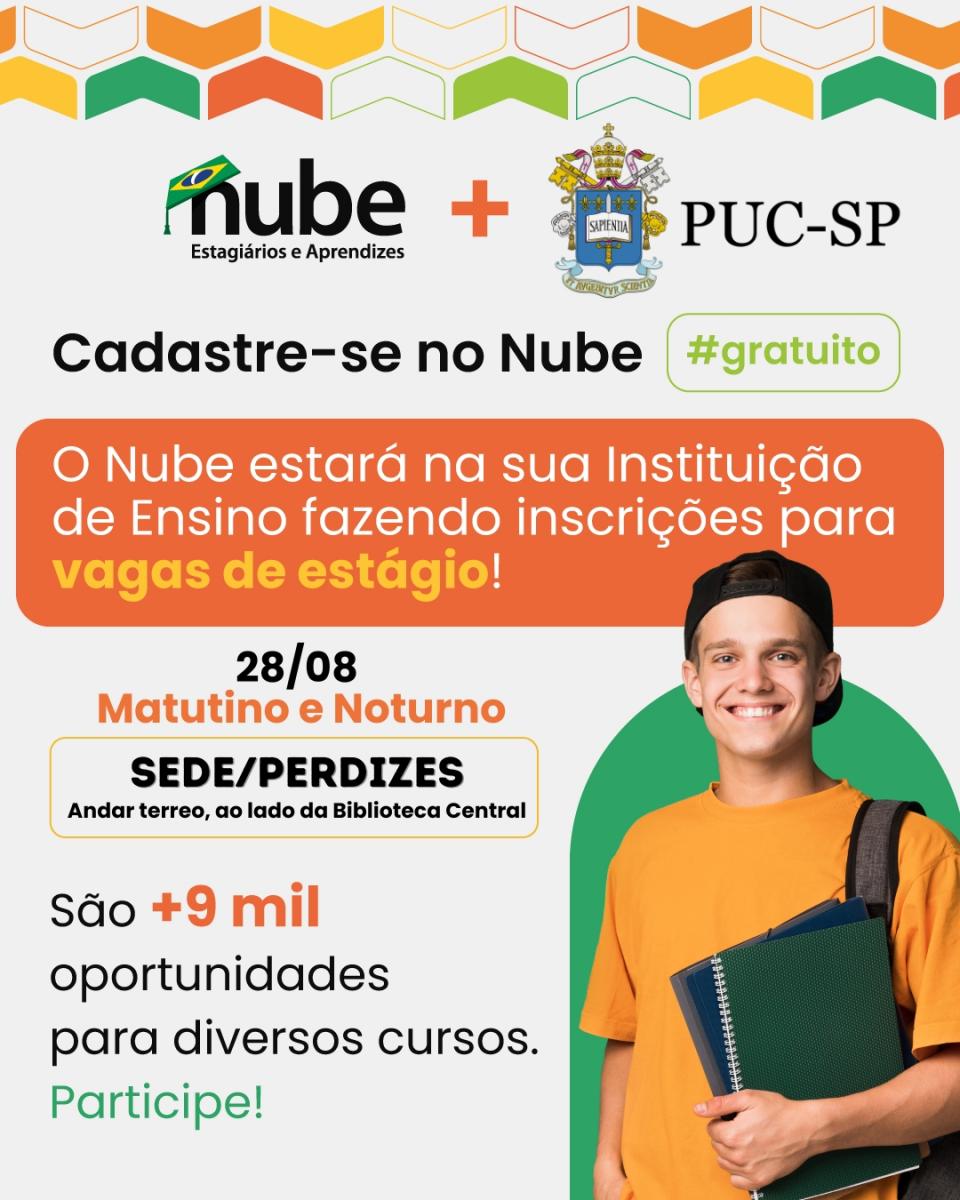 O Setor de Estágios da PUC-SP promove uma ação em parceria com a NUBE no campus Perdizes. Na atividade, os interessados poderão cadastrar seus currículos em vagas de estágio. São mais de 9 mil vagas disponíveis para os alunos do período matutino e noturno.
