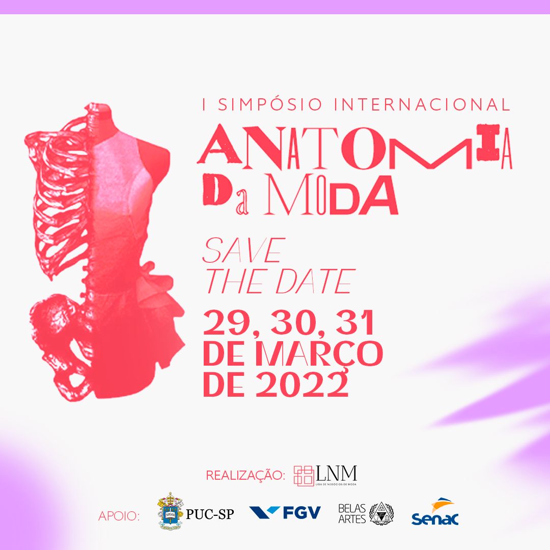 Entre os dias 29, 30 e 31 de março de 2022, das 17 às 21h, se realiza o I Simpósio Internacional Anatomia da Moda, que tem entre as curadoras a profa. Ana Claudia de Oliveira (Pós em Comunicação e Semiótica).
