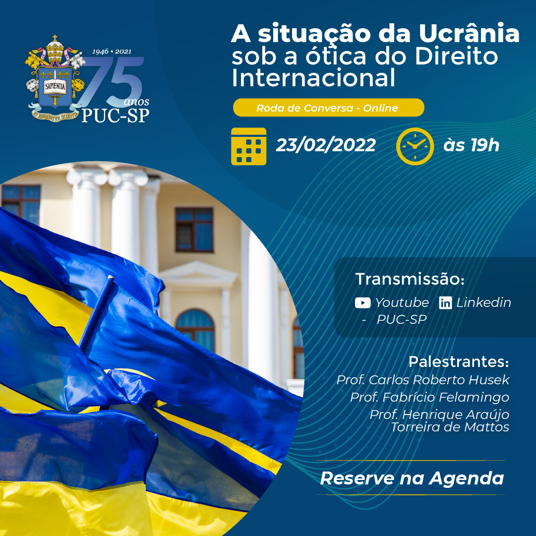 Dia 23/2, às 19h, o curso de especialização em Direito Internacional realiza a roda de conversa online A situação da Ucrânia sob a ótica do Direito Internacional.