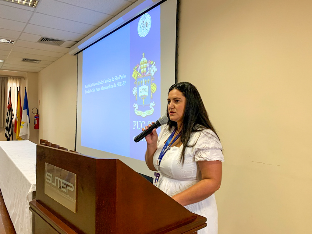 Shelley Arruda Pinhal de Camargo, psicóloga da FCMS, abriu o evento e destacou a importância da integração entre a universidade, os alunos e suas famílias no desenvolvimento acadêmico e pessoal dos estudantes.