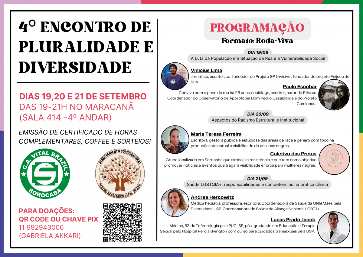 Entre os dias 19 e 21/9, a Faculdade de Ciências Médicas e da Saúde (FCMS) sediará o 4º Encontro de Pluralidade e Diversidade. O evento será realizado no Auditório Maracanã, das 19 às 21 horas, e é organizado pelo Departamento Sociocultural do Centro Acadêmico Vital Brazil, que representa os estudantes do curso de Medicina.
