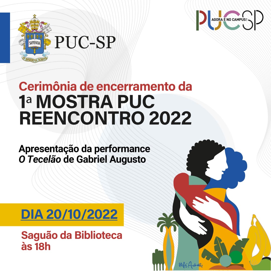 A importância de eventos presenciais que estimulam as manifestações artísticas e culturais, como esta Mostra, possibilitou apresentar diversas linguagens artísticas, após dois anos de isolamento social, propiciando Reencontro e interação!! Consideramos sua realização um grande feito para toda a comunidade acadêmica! Em um ano de ímpar significação para o Brasil, a retomada das atividades culturais e políticas da universidade, a [re]ocupação dos espaços tem o significado do re-exisitir e da ressignificação da Universidade. A possibilidade do Reencontro, como nos mostra a Arte do tão saudoso Elifas Andreato - homenageado na Abertura da Mostra – e da presença dos ex-alunos na Mostra, além da comunidade de professores, funcionários e estudantes, indica caminhos a serem estimulados, com a PUC aberta à comunidade, não só um marco da Cidade, mas também um espaço relevante da cultura e das artes!! Que a arte nos inspire nas tarefas que nos esperam à frente!