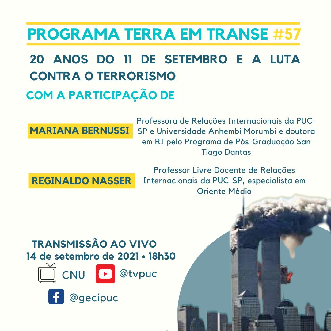 No dia 14/9, às 18h30, vai ao ar mais uma edição do Terra em Transe, programa em parceria do Grupo de Estudos sobre Conflitos Internacionais (GECI) com a TV PUC. O tema desta vez é 20 anos do 11 de setembro e a luta contra o terrorismo .