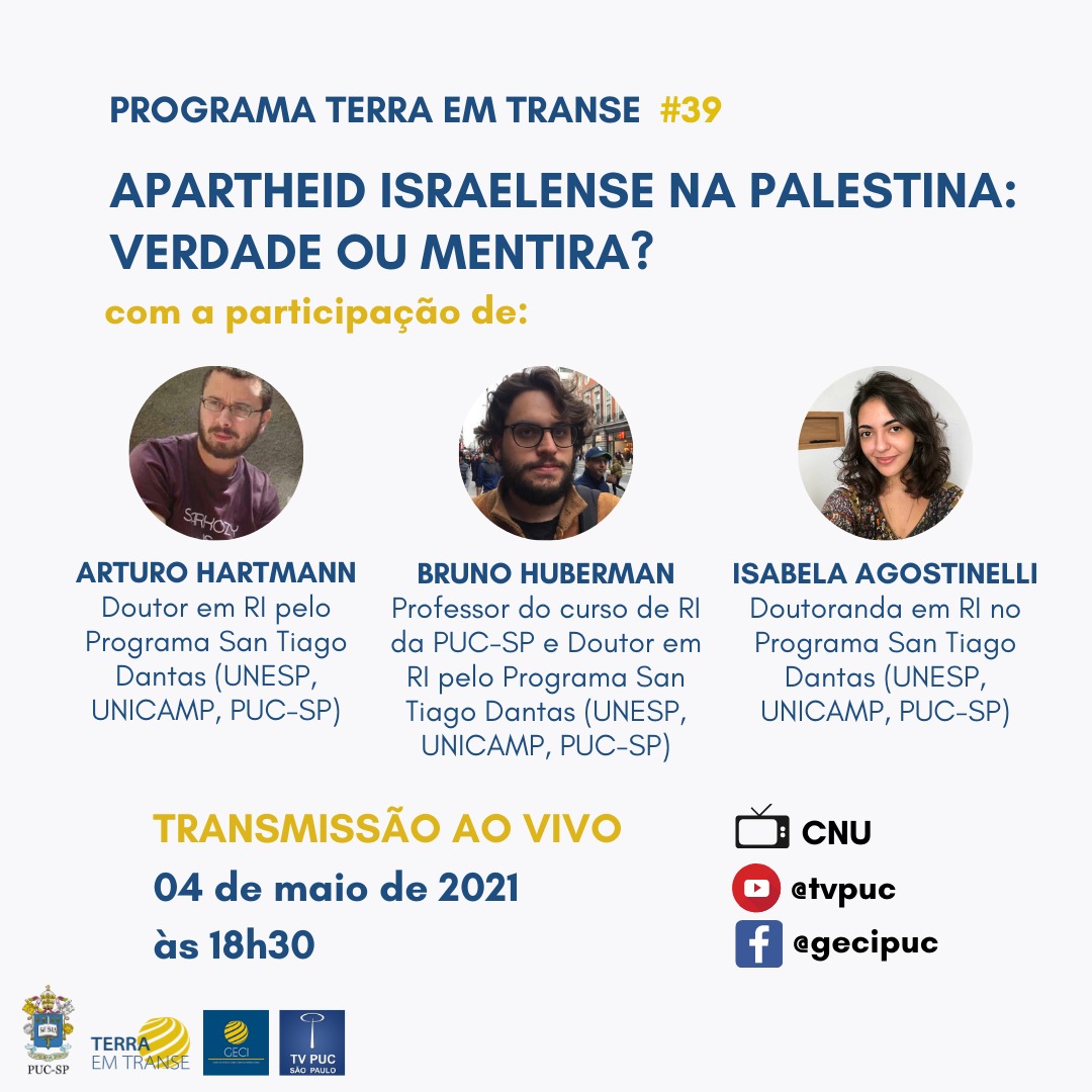 No dia 4/5, às 18h30, vai ao ar mais uma edição do Terra em Transe, programa em parceria do Grupo de Estudos sobre Conflitos Internacionais (GECI) com a TV PUC. O tema desta vez é Apartheid israelense na Palestina, verdade ou mentira?