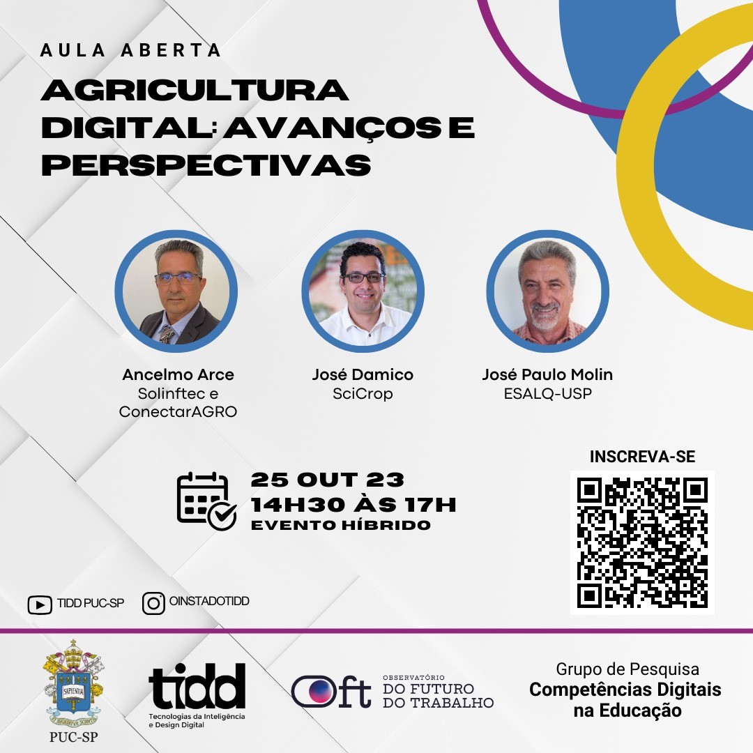 No dia 25/10, das 14h30 às 17h, acontece a aula aberta "Agricultura Digital: avanços e perspectivas", promovida pelo Pós em Tecnologia e Design Digital (TIDD).