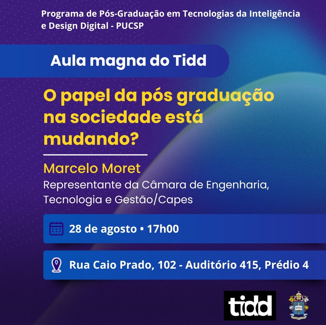 O Programa de Pós-Graduação em Tecnologias da Inteligência e Design Digital da PUC-SP promove a Aula Magna O papel da pós-graduação na sociedade está mudando?, com Marcelo Moret, representate da Câmara de Engenharia, Tecnologia e Gestão/Capes.