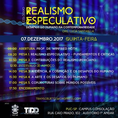 O grupo de pesquisa TransObjetO do Pós em Tecnologias da Inteligência e Design Digital (TIDD) realizará, no dia 7/12, no campus Consolação, o II Colóquio Realismo Especulativo: desafios do humano na contemporaneidade, organizado pela professora Lucia Santaella. O evento procura explorar desde os fundamentos desta tendência filosófica, passando pelas críticas a ela, pelas possíveis interfaces com outras teorias filosóficas, chegando às possíveis relações com a arte, a ciência e a vida cotidiana.