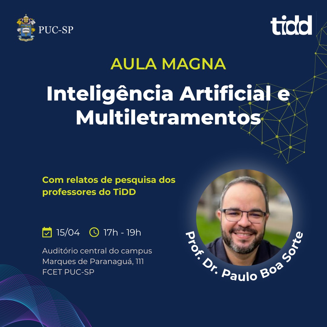 A coordenação do Pós em Tecnologias da Inteligência e Design Digital (TIDD) promove no dia 15/04/2024, às 17h, a aula magna "Inteligência Artificial e Multiletramentos", ministrada pelo prof. Paulo Boa Sorte.