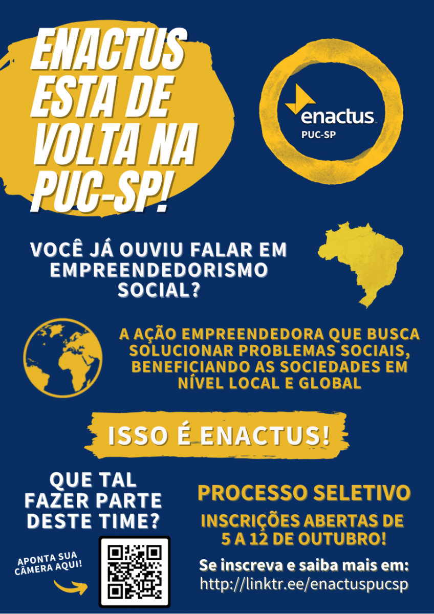 Estão abertas as inscrições para o processo seletivo de interessados em participar do time Enactus, que está sendo conduzido por alunos dos cursos de Administração e de Direito.