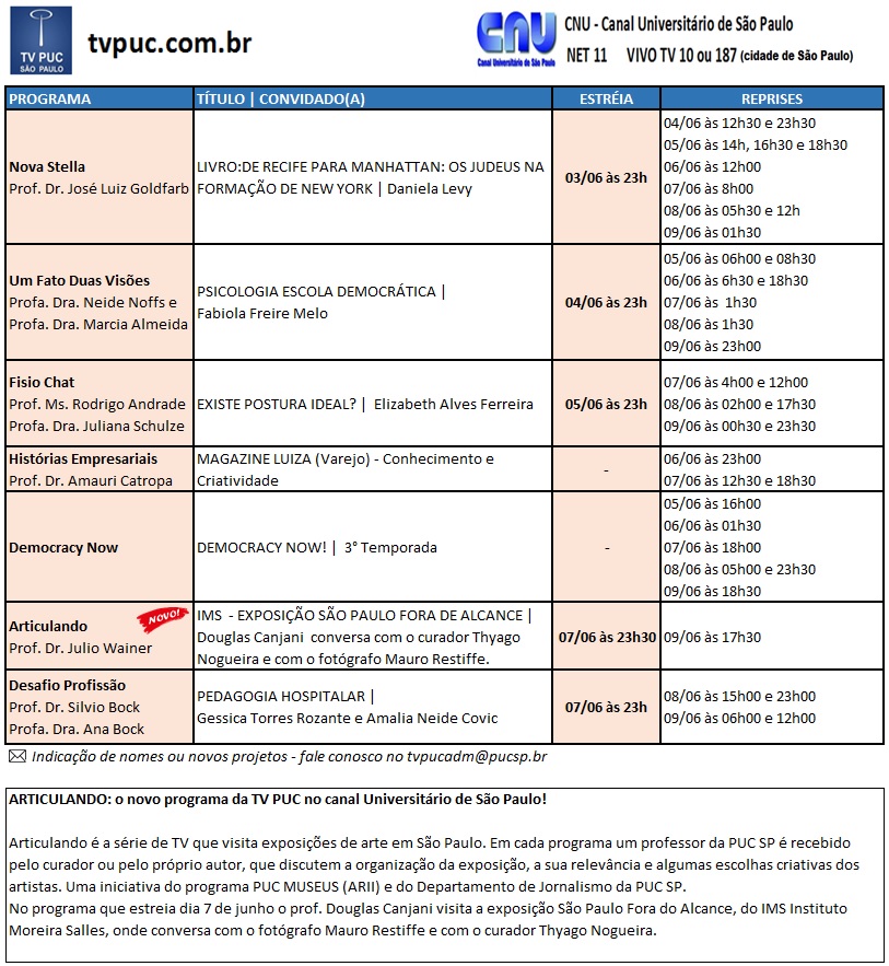 Veja o que o Canal Universitário exibe da Tv PUC, durante a semana de 3 a 9/6.