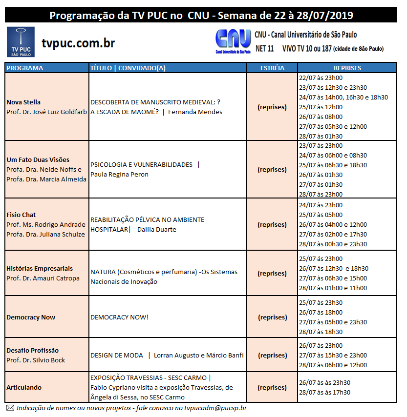 Confira o que o Canal Universitário exibe da TV PUC durante a semana de 22 a 28/7: