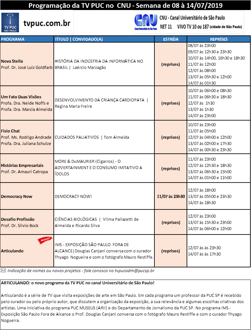 Confira o que o Canal Universitário exibe da TV PUC durante a semana de 8 a 14/7:
