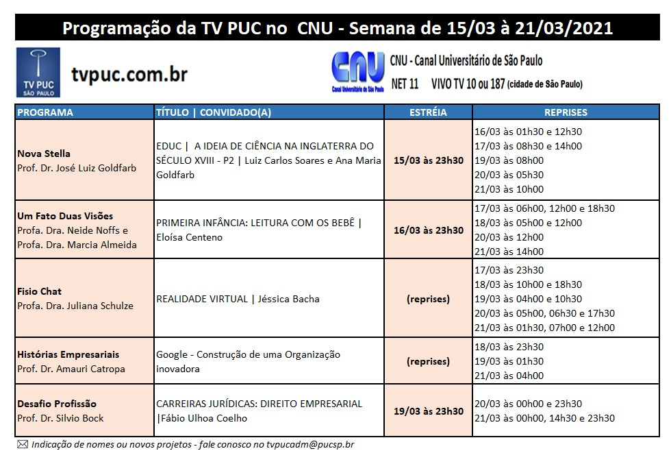 Confira o que o Canal Universitário exibe da TV PUC durante a semana de 15 a 21/3.
