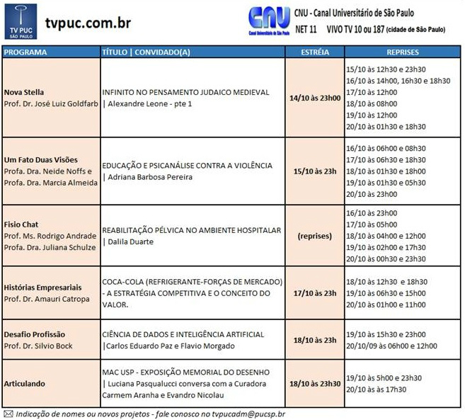 Conheça a programação da TV PUC no Canal Universitário, de 14 a 20/10
